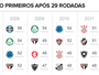 - 15h35Guia do título: nove pontos à frente, Fluminense tem 90% de chancesSomente Grêmio (6%) e Atlético-MG (4%) alimentam esperança de derrubar o líder. Na luta pela Libertadores, vitória do São Paulo altera o panorama